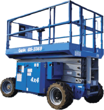 Genie GS3369RT I stort lika som föregående lift 73-3263-00, men med andra mått enligt nedan. Liften är 4-hjulsdriven, dieseldriven utomhuslift med mycket stor framkomlighet. Utrustad med självnivellerande ben och 2 hastigheter som gör maskinen snabb, dessutom till ett lågt pris. Utrustad med motorvärmare som säkrar körning även i vintertid.